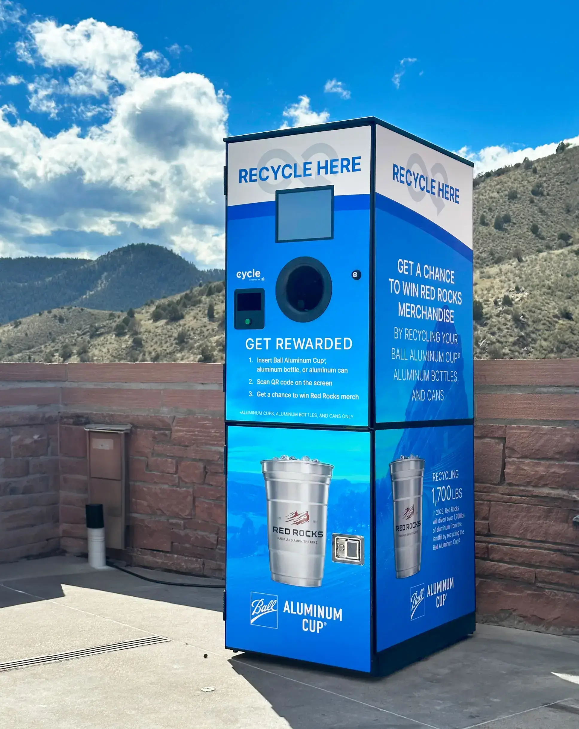 Ball, a leading global provider of sustainable aluminum beverage packaging, worked with leading RVM provider Cycle, powered by Recycle Track Systems® (RTS), to install the machine. The RVM aims to increase recycling rates at Red Rocks and educate consumers about the benefits of using aluminum. Guests can insert their Ball Aluminum Cup®, aluminum can or aluminum bottle into the front of the machine, which then uses a conveyor belt to scan, crush and sort the aluminum packaging. Once the packaging is sorted, users will have the opportunity to scan a QR code to enter a chance to win Red Rocks merchandise.